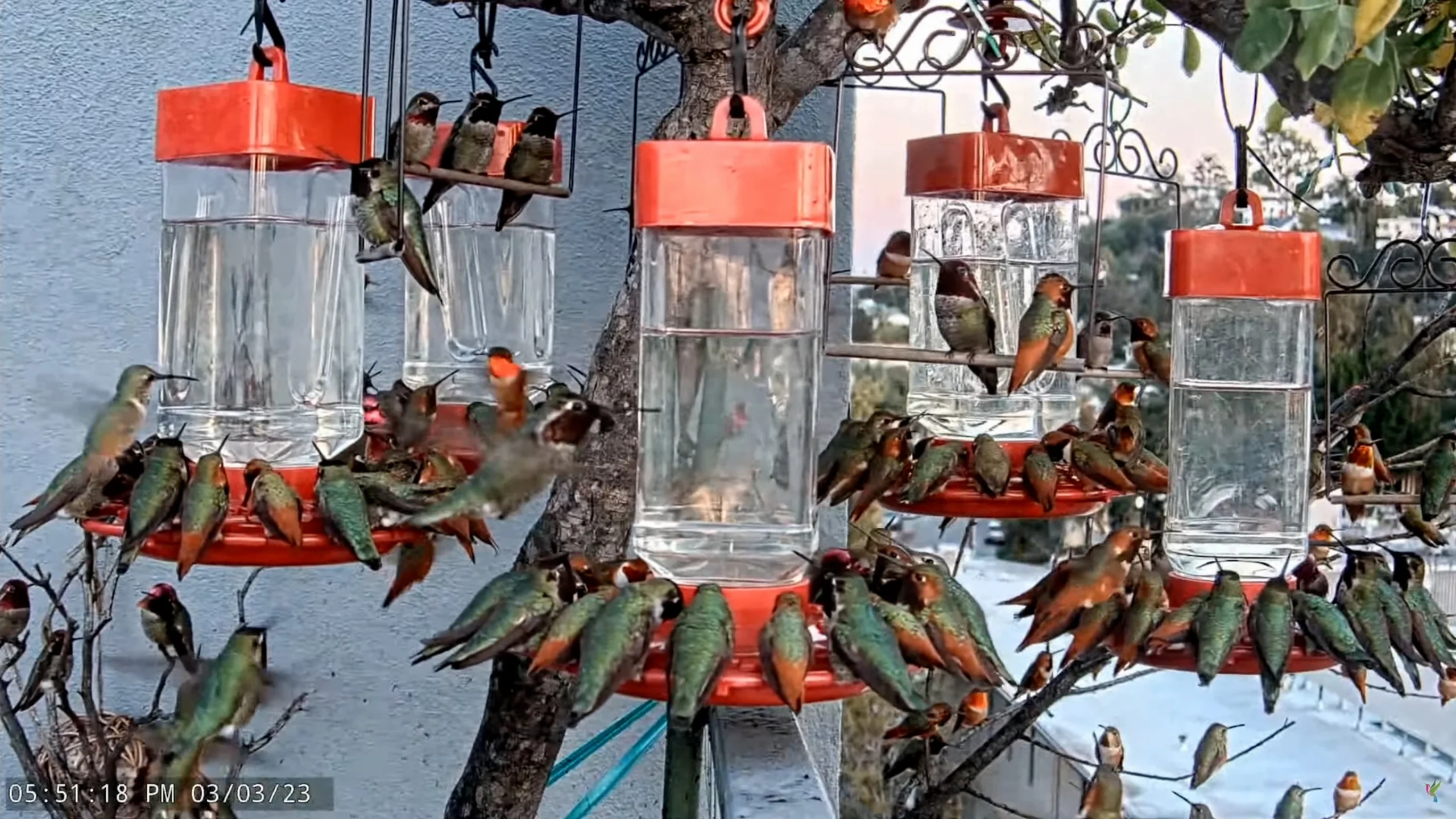 Our current camera is in Simi Valley, California, and it attracts many hummingbirds including Allen’s, Anna’s and Costa’s. We will welcome Black-chinned Hummingbirds in the summer and hopefully see a Rufous or a Calliope migrating through in the late winter.